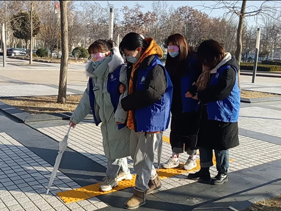活动开始,志愿者先给体验者们讲解活动规则,并说明了举办此次体验活动的目的。体验者们并没有因为寒风熄灭热情,积极的参与到体验活动中,穿蓝色马甲的志愿者们不断维持现场秩序,引领体验者走完这段特殊的路。体验者们蒙上眼罩,在志愿者的搀扶下走上盲道,并用雨伞充当导盲棍,亲身体验视障人群的不便。体验者正在体验视障人群走盲道。志愿者扮演路人占用盲道充当障碍,体验者需要在看不见的情况下,劝说路人离开盲道,利用盲道走到终点。经过长时间的摸索前进,体验者们都陆陆续续走到了终点。活动圆满结束,体验者在“述说体验心得”这一环节说出了这次体验的感受,深深的感到了视障人群的不容易,希望通过此次活动呼吁大家关爱视障人群,自觉避免占用盲道。