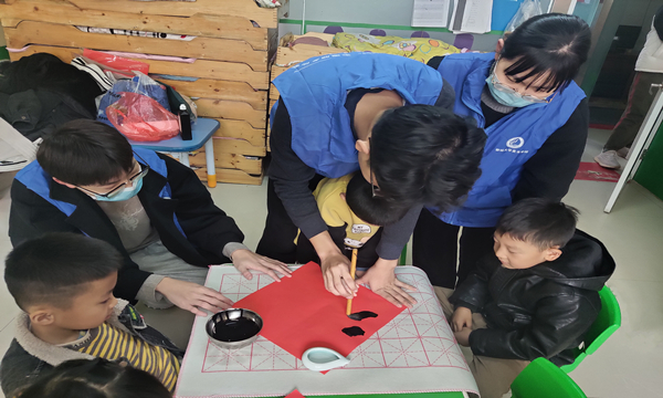 活动开始前,志愿者们准备好所需的材料,进行多次练习,以确保活动的顺利进行。对于中国人来说,“福”字可能是最为熟悉的汉字之一,重大传统节日都要祈福,过年春节家家门口贴“福”字,在中国传统文化和礼仪里,“福”字的地位可谓是至高无上。活动进行时,志愿者们向孩子们讲述了春节的由来以及等相关习俗的讲解,阐释了传承千百年来的中华文化底蕴。随后,志愿者们拿出准备好的材料,讲授了如何开笔、握笔,书法过程中的要点,还当场示范了一些基本笔画的运笔方法,并现场手把手教每一位小朋友。,小朋友们的目光都被吸引住了,一个个争先恐后的想来尝试。互动过程中,小朋友现场挥毫泼墨,纷纷创作出自己满意的作品,一幅幅刚劲有力的书法作品呈现在大家眼前。活动结束后,小朋友们拿起各自写的“福”字进行拍照留念,在他们的成长路上留下成长印记。