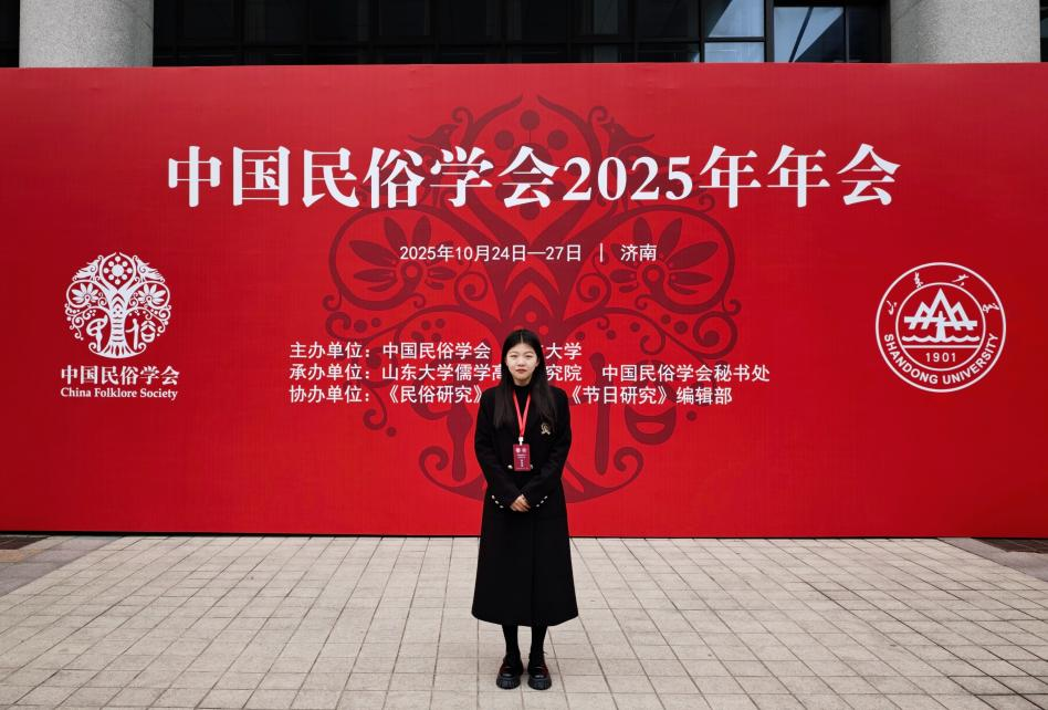 10月24—27日,由中国民俗学会、山东大学联合主办的“中国民俗学会2025年年会”在山东大学中心校区开幕,本次年会的主题是“全球化与本土化对话中的民俗学自主知识体系建设”。本届年会内容广泛,涉及民俗学标识性概念、中国故事学、中国民间文学本土理论、非物质文化遗产保护、泰山文化等多个前沿话题。suncitygroup太阳集团2023级美术学专业研究生邢怀焱论文入选并应邀参会。