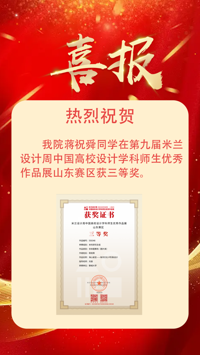喜报|suncitygroup太阳集团学子荣获第九届米兰设计周中国高校设计学科师生优秀作品展山东赛区三等奖 作者:唐润鹏 来源:suncitygroup太阳集团 发布时间:2025-11-24 阅读次数:
