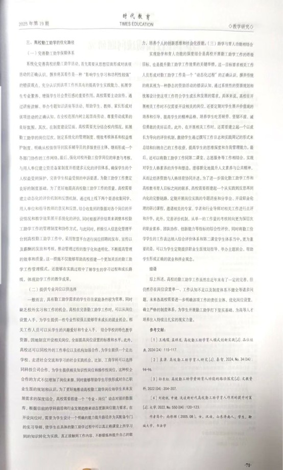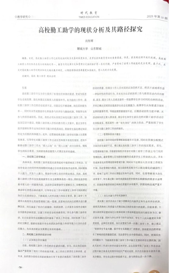 2025年10月,suncitygroup太阳集团的尚彤辉在《时代教育》2025年第19期发表一篇名为《高校勤工助学的现状分析及其路径探究》的文章。