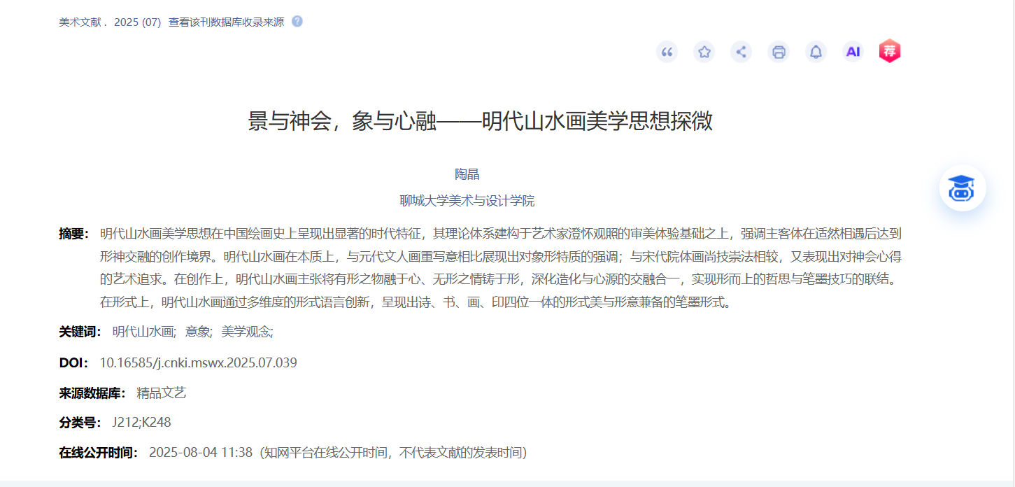 2025年8月论文《景与神会,象与心融:明代山水画美学思想探微》发表于《美术文献》;